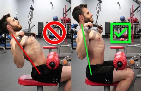 1. 머신에 앉아 발을 고정하고, 손잡이를 어깨너비 또는 좁게 잡습니다.(그립에 따라 다름)