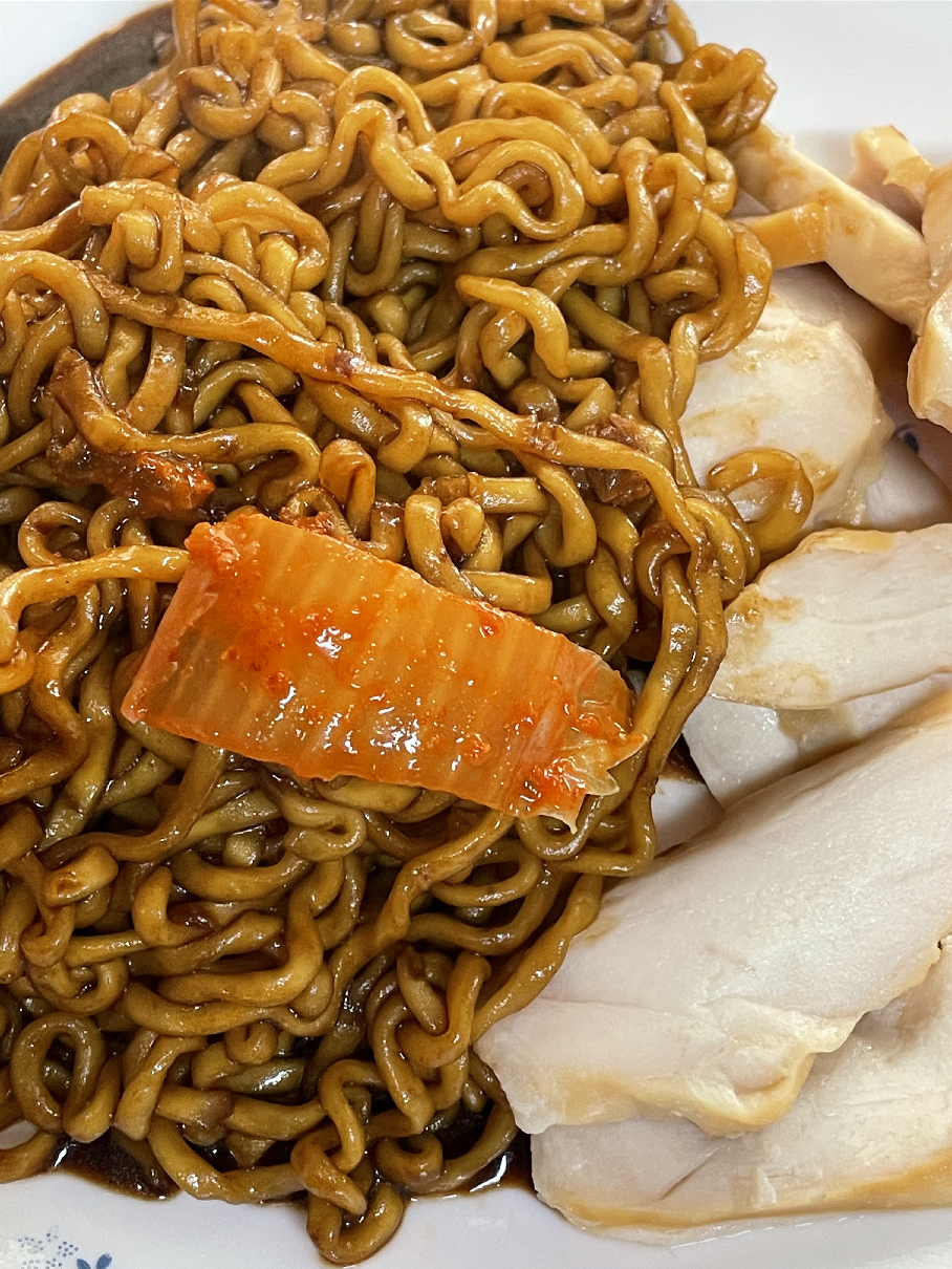 이것은 짜파게티 + 닭가슴살 + 김치 식단(?)으로